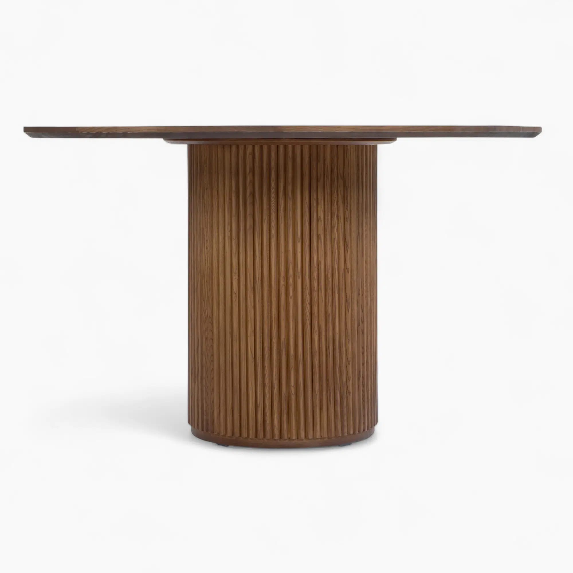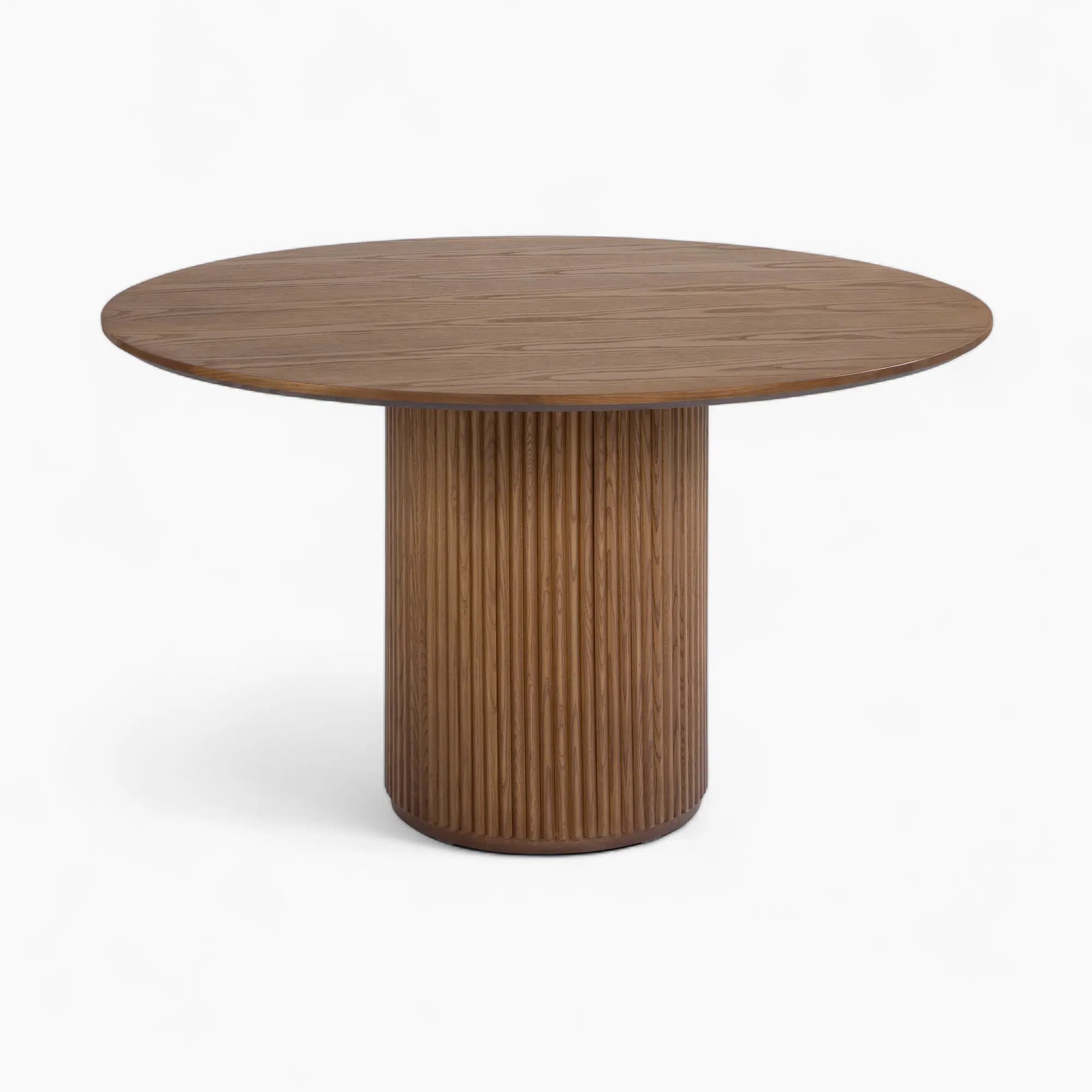 The Decelle Round Dining Table captures the balance between modern minimalism and sculptural craftsmanship. Its smooth round top rests gracefully on a textural reeded base, blending organic warmth with architectural strength. Crafted from rich ash wood, it creates a tactile and timeless centerpiece for dining or working.