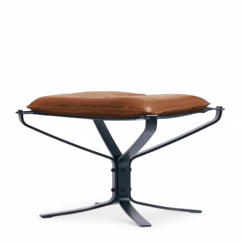 Emerging from the Scandinavian design movement of the 1970s, the Falcon Chair and Ottoman captures the spirit of relaxed elegance and craftsmanship that defined the era. Its distinctive hammock-style seat and hand-dyed metal frame create a striking balance between lightness and strength, while supple top-grain leather provides lasting comfort.