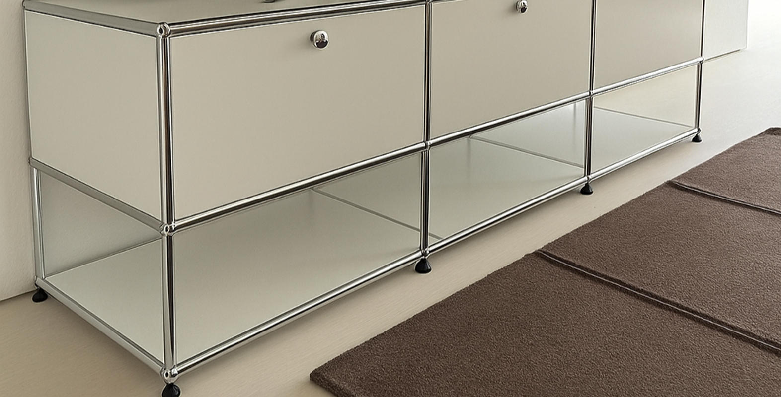 Rooted in the precision and clarity of 1960s Swiss design, the Haller Sideboard H2 embodies the Bauhaus ideals of function and simplicity. Its chrome-plated steel frame, powder-coated panels, and modular structure offer enduring strength and versatility. Designed to adapt effortlessly over time, it serves as a timeless media console that blends architectural form with everyday practicality.