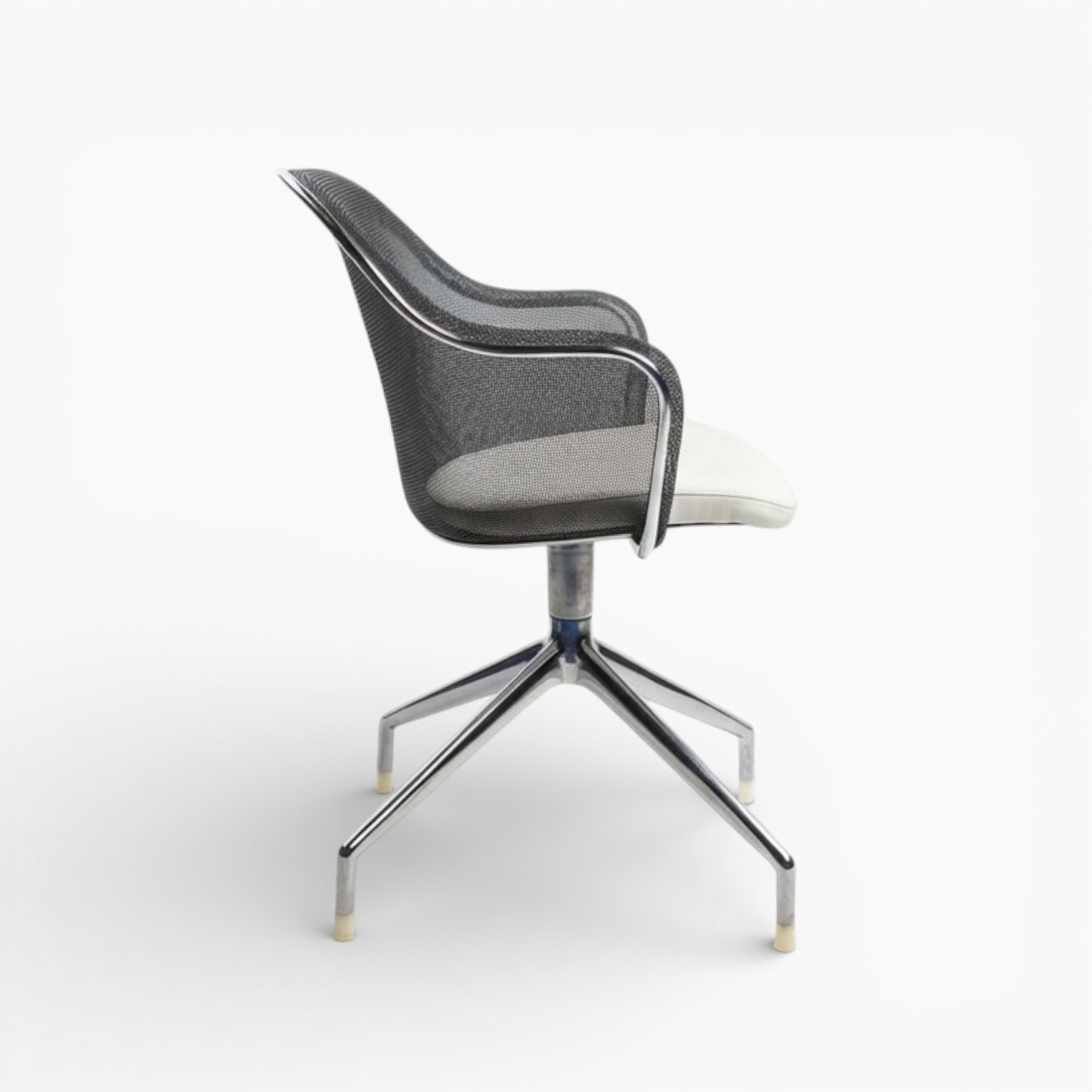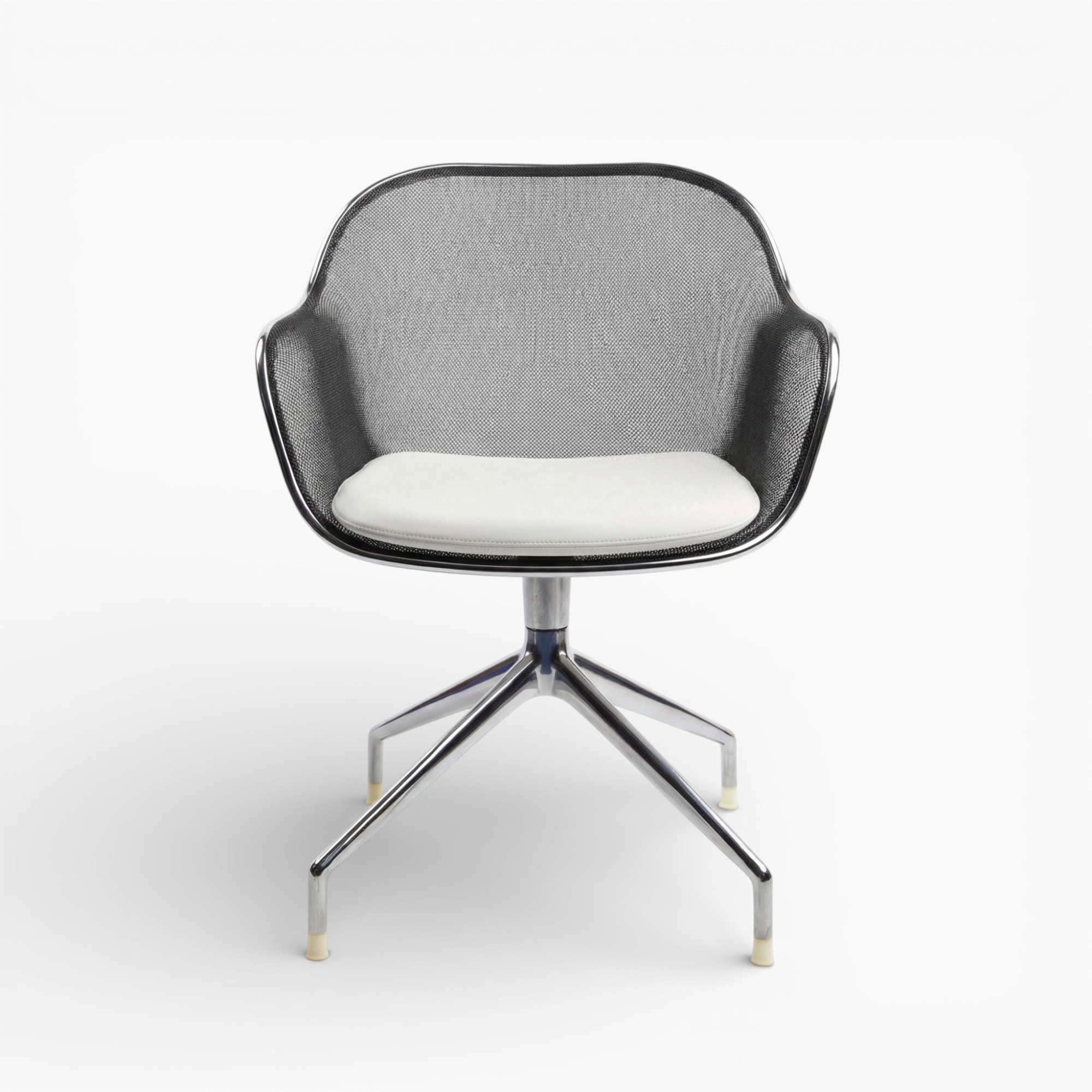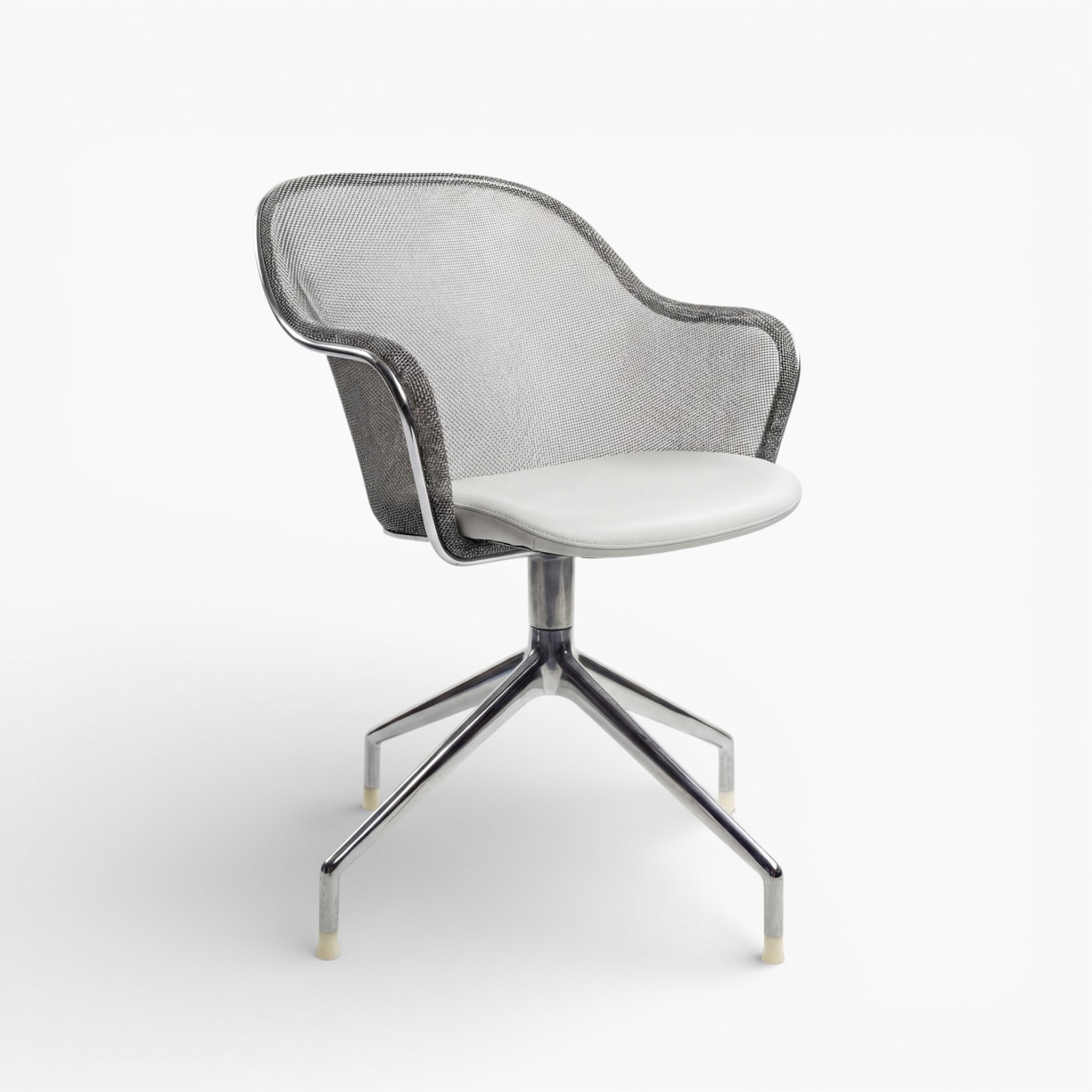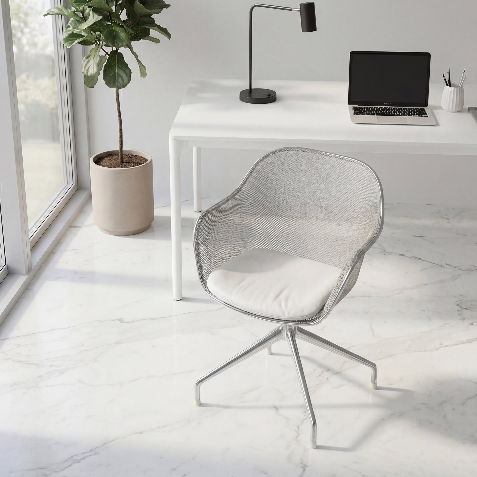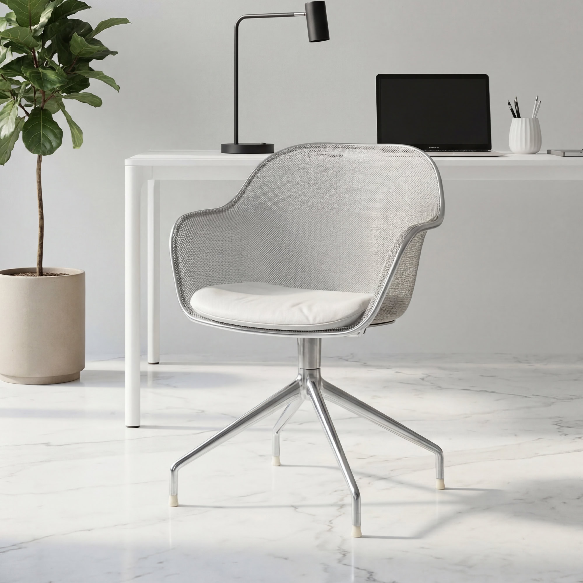 The Iuta Swivel Chair features a minimalist aluminum frame and breathable mesh back, offering a light and airy look that complements contemporary office or home interiors.