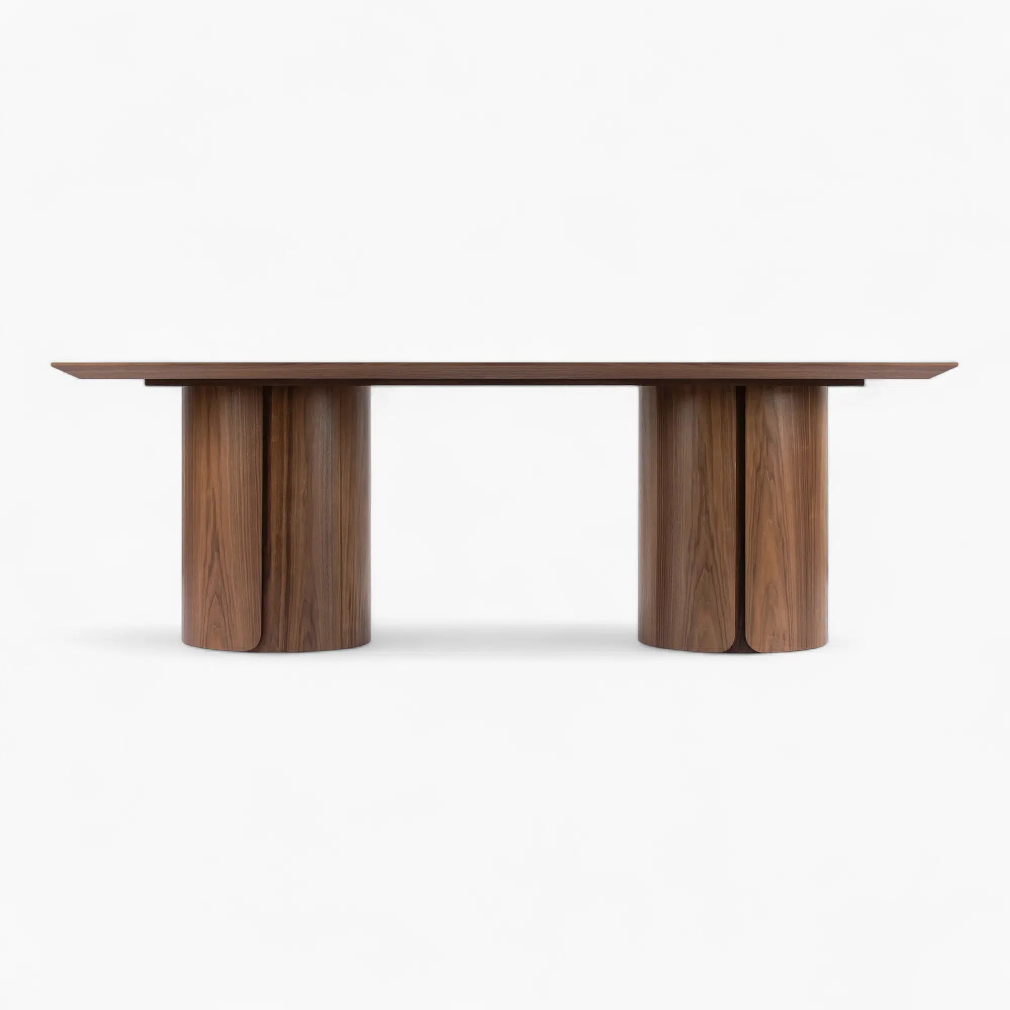 The Opus Dining Table embodies a refined balance of strength and sophistication, bringing a touch of sculptural artistry to modern dining spaces. Its rich walnut finish adds warmth and depth, while the solid pillar legs feature recessed channel detailing that gives the base both character and stability. A chamfered-edge tabletop enhances its sleek silhouette, blending clean geometry with a sense of crafted softness.