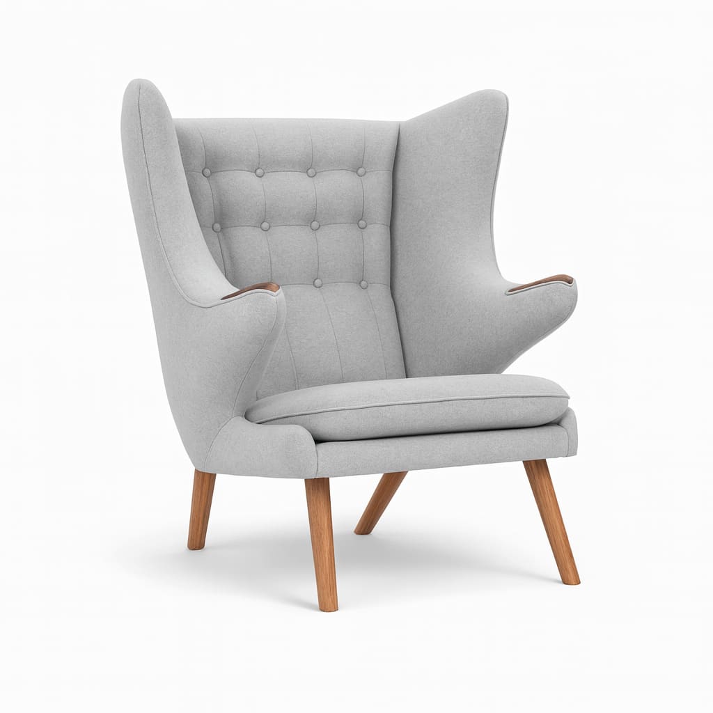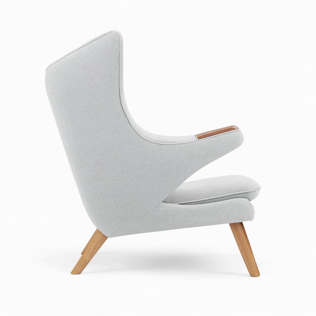 Born in the 1950s, the Papa Bear Chair and Ottoman embody the warmth and optimism of postwar design, blending organic shapes with enduring comfort. Its sculpted wooden arms and wingback form create an inviting sense of security, while plush upholstery and solid craftsmanship make it as supportive as it is striking.