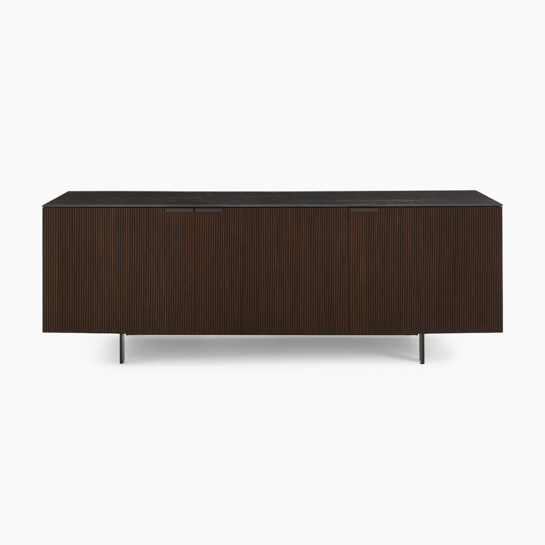 Inspired by the refined cabinetry of late 20th-century Europe, the Selvans Sideboard 3 Doors pairs a clean architectural silhouette with finely grooved walnut veneer that adds depth and texture from every angle. Its ceramic stone top brings a durable, easy-care surface for everyday use, while slim metal legs lighten the overall profile. Behind three seamless doors, generous hidden storage helps keep your space organized without disrupting the calm, sculptural look.
