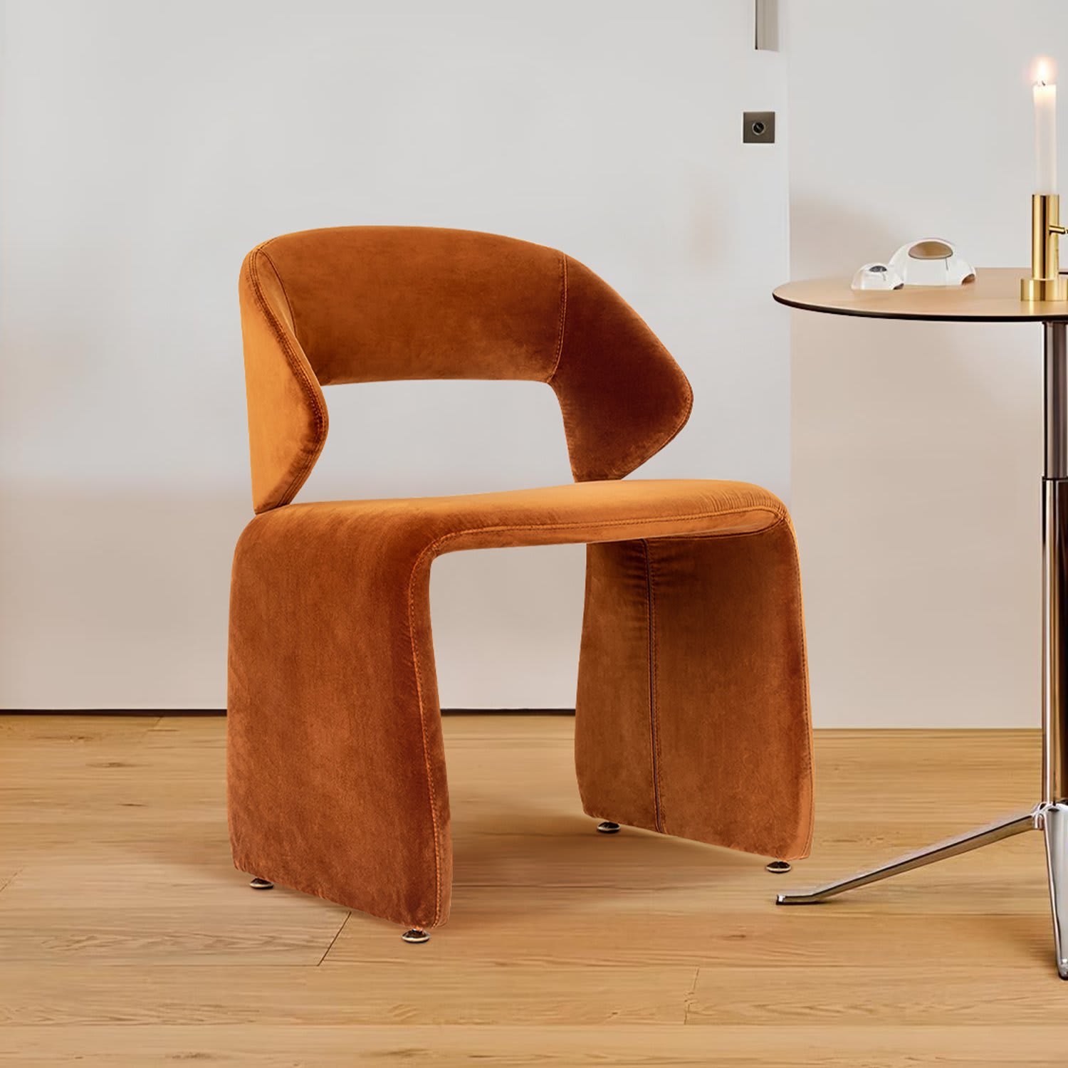 Emerging from the refined design sensibilities of the mid-century era, the Monica Suit Chair blends sculptural elegance with functional comfort. Its molded fiberglass shell provides lasting support, while soft velvet upholstery adds a touch of warmth and luxury. Defined by smooth, ergonomic curves, this chair brings comfort and sophistication to dining spaces, work areas, or lounges.