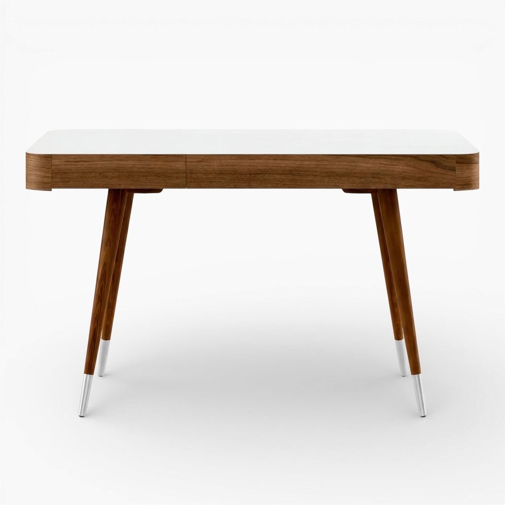 The desk includes two drawers; one narrow with dividers for organizing small items and one wide for larger storage. This design ensures that your workspace remains clutter-free, offering ample storage for office essentials.